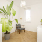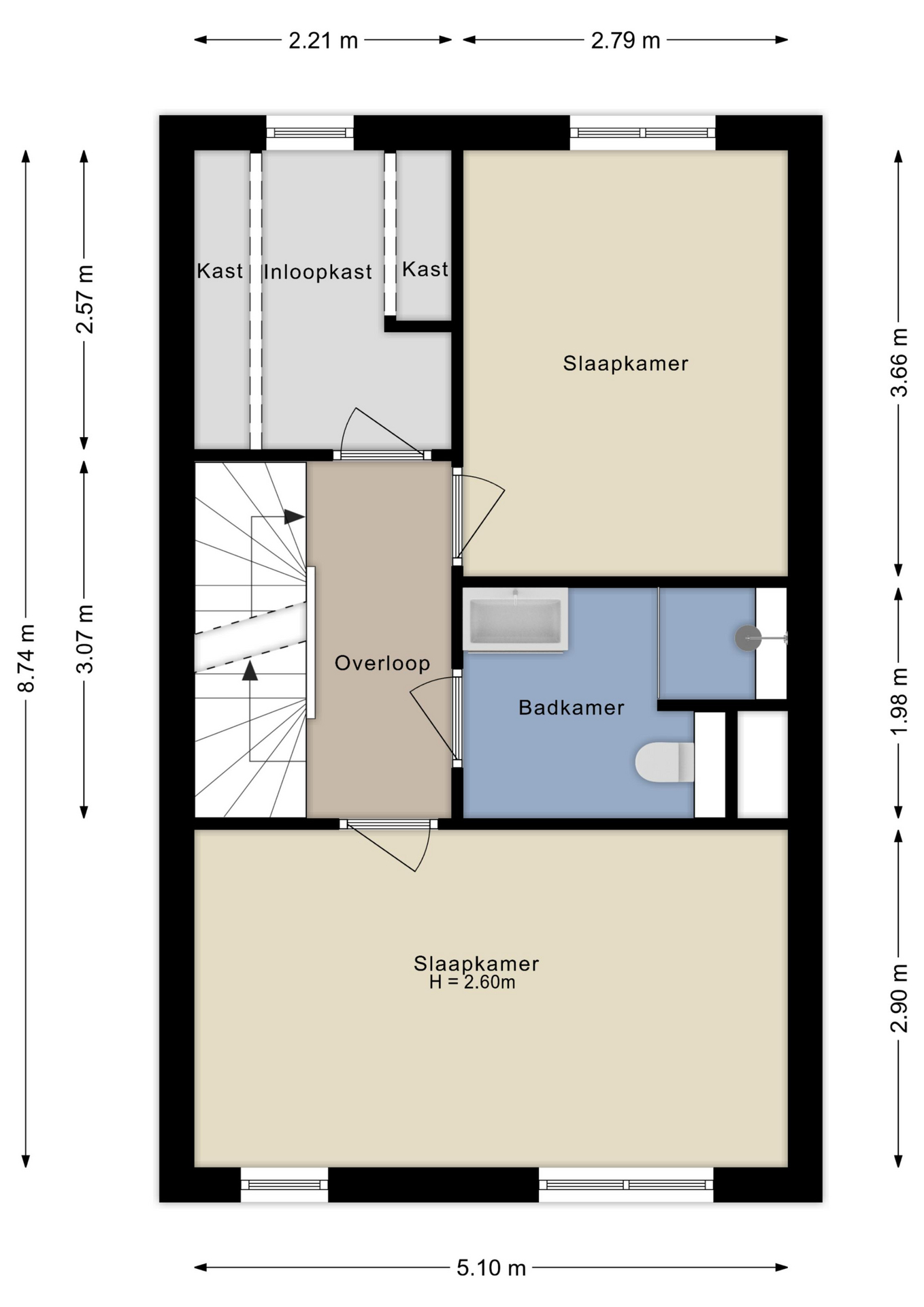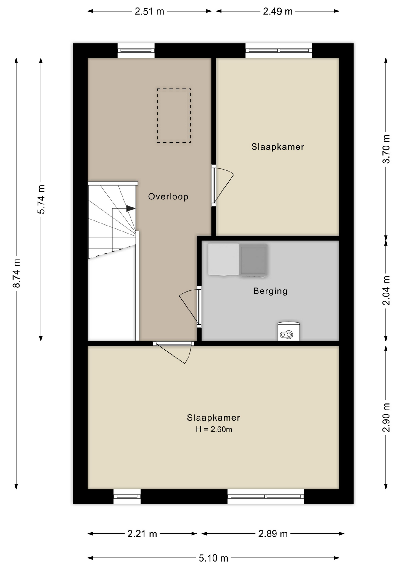 De ruime overloop biedt extra opbergruimte en kan desgewenst worden gebruikt als werkplek. Verder zijn er nog twee nette slaapkamers en een technische ruimte met o.a. de aansluiting voor wasmachine en droger. De kamers zijn licht, ruim en strak afgewerkt.