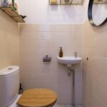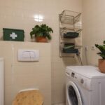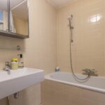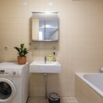 De volledig betegelde badkamer is uitgerust met een bad/douchecombinatie, een wastafel, een spiegelkast en een toilet. De witgoedaansluitingen zijn tevens in de badkamer gesitueerd.