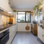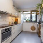 De keuken is ingericht met een licht keukenmeubel in een rechte opstelling, voorzien van diverse inbouwapparatuur: een 4-pits inductiekookplaat, afzuiging, combi-oven, koel-/vriescombinatie en een vaatwasser.