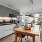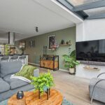 De tuingerichte woonkamer geeft een mooi uitzicht, door de grote schuifpui, over de achtertuin. Op de begane vloer ligt een eikenhouten vloer. Aan de voorzijde is de moderne keuken gesitueerd. De keuken is voorzien van een Boretti oven met inductiekookplaat, afzuigkap, koelkast, vaatwasser en magnetron. Prettig zijn de grote ramen met deur naar de voortuin en de mogelijkheid tot natuurlijke ventilatie. Door de uitbouw van de serre is de woonkamer ruimer geworden en heerlijk licht door de vele ramen.