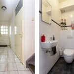 Entree, hal met tegelvloer, spuitwerkwanden, meterkast, modern afgewerkte toiletruimte en toegang tot de bijkeuken met wasmachine- en drogeraansluiting en deur naar de schuur.