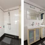 De gemoderniseerde badkamer is geheel betegeld en voorzien van een grote inloopdouche met thermostaatkraan, twee badmeubels met wastafel, hangend closet, designradiator en raampartij.