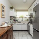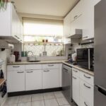 Aan de voorzijde van de woning is de halfopen keuken gelegen, die is voorzien van standaard keukenblok in hoekopstelling met RVS-koel-/vriescombinatie, gaskookplaat, combimagnetron, afzuigkap, vaatwasser en veel werk- en kastruimte.