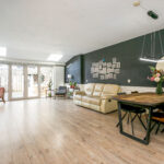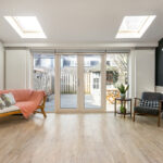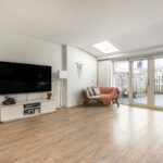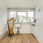 De woonkamer is zéér ruim van afmeting door de 2 meter lange uitbouw en heerlijk licht door de openslaande deuren en de twee Velux-dakramen. De tuingerichte woonkamer is verder voorzien van een laminaatvloer, gestucte wanden en deels lambrisering, twee designradiatoren en een praktische trapkast.