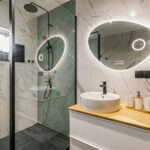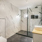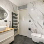De badkamer (2023) is modern afgewerkt en geheel betegeld. Verder is de ruime badkamer voorzien van een grote inloopdouche met thermostaatkraan, wastafelmeubel met spiegel voorzien van verlichting en verwarming, hangend closet met bidet functie en designradiator. Prettig is het raampje welke zorgt voor lichtinval en natuurlijke ventilatie.
