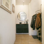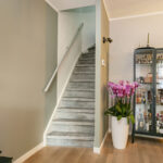 Hal met tegelvloer, gestucte wanden, meterkast met nieuwe -en uitgebreide groepenkast, modern afgewerkte toiletruimte met hangend closet en fonteintje, garderoberuimte, kleine trapkast en toegang tot de woonkamer.