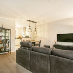De tuingerichte woonkamer is heerlijk licht door de grote raampartij en tuindeur en is stijlvol afgewerkt met een massief houten parketvloer en glad gestucte wanden -en plafond. Tevens tref je hier de trapopgang naar de 1e verdieping aan.