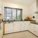 De keuken bevindt zich aan de voorzijde van de woning en is voorzien van een vrij modern keukenblok in U-opstelling met granieten aanrechtblad en diverse inbouwapparatuur, te weten: koel-/vriescombinatie, keramische kookplaat, heteluchtoven, magnetron, RVS-afzuigkap, vaatwasser, close-in boiler en veel werk- en kastruimte.