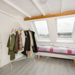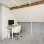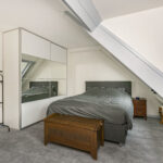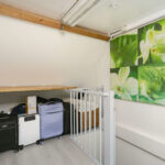 De multifunctionele zolderkamer is ruim van afmeting en voorzien van een laminaatvloer, geïsoleerde wandplaten, twee nieuwe Velux-dakramen met verduistering-screens en bergruimte zowel achter de schotten als op de vliering.
