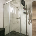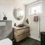 De badkamer is in 2023 geplaats en luxe en modern uitgevoerd. De geheel betegelde ruimte is voorzien van een grote inloopdouche met thermostaatkraan én regen- en handdouche, badmeubel met waskom, wandkast, verlichte spiegel, hangend closet, designradiator, elektrische vloerverwarming en kunststof raampartij.