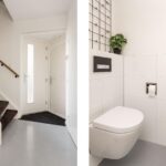 Entree, hal, deur naar de garage, trapopgang naar de eerste verdieping, toiletruimte met hangend closet en fonteintje, meterkast en toegang naar de woonkamer.