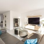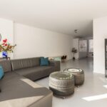 De ruime uitgebouwde woonkamer bevindt zich aan de achterzijde van de woning. Door de grote schuifpui is er veel lichtinval en stap je zo de tuin in.