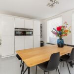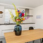 De moderne open keuken bevindt zich aan de voorzijde van de woning. Deze is voorzien van een composiet aanrechtblad en diverse hoogwaardige inbouwapparatuur: extra grote koelkast, vriezer, combi stoom-oven, combi stoom-magnetron, RVS-afzuigkap, inductiekookplaat, Quooker, vaatwasser en veel kastruimte.