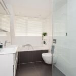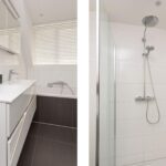 In de luxe badkamer vind je een douchecabine met regendouche, ligbad, badmeubel met dubbele wastafel, spiegelkast en hangend closet.