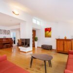Via een fraaie paneeldeur bereik je de royale woonkamer met een oppervlakte van maar liefst 53m². Wat gelijk opvalt zijn de vele raampartijen en het schuine, hoge plafond. Verder zijn er een massief houten vloer, spuitwerk muren, een sfeervolle gestucte gashaard en openslaande deuren naar de achtertuin. Er is een convectorput aanwezig en de radiatoren zijn vernieuwd.