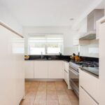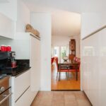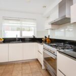 De moderne open keuken bevindt zich aan de voorzijde van de woning is geplaatst in een ruime L-opstelling en een separate kastenwand. De keuken is hoogglans wit met een graniet aanrechtblad en voorzien van diverse (inbouw)apparatuur; RVS 6-pitsgasfornuis met een extra brede elektrische oven, RVS afzuigkap, vaatwasser en Quooker. In de kastenwand bevinden zich de grote koelkast, vriezer en extra opbergruimte. De muren in de keuken zijn gestuukt.
