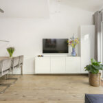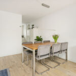 De gehele begane grond is afgewerkt met een fraaie eiken whitewash laminaatvloer.