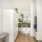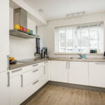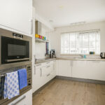 Aan de voorzijde bevindt zich de moderne en ruime keuken in een hoogglans witte uitvoering. De keuken is voorzien van diverse inbouwapparatuur, waaronder een keramische kookplaat, afzuigkap, combimagnetron/heteluchtoven, koelkast, vriezer en vaatwasser.