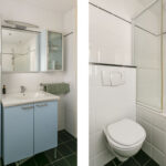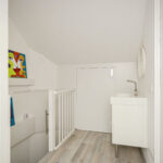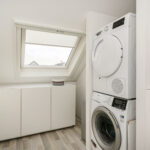 De tweede verdieping is strak afgewerkt en biedt een royale overloop met opstelplaats voor wasmachine, droger en de cv-ketel. Tevens bevindt zich hier een praktisch wastafelmeubel.