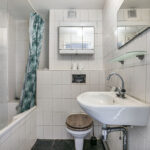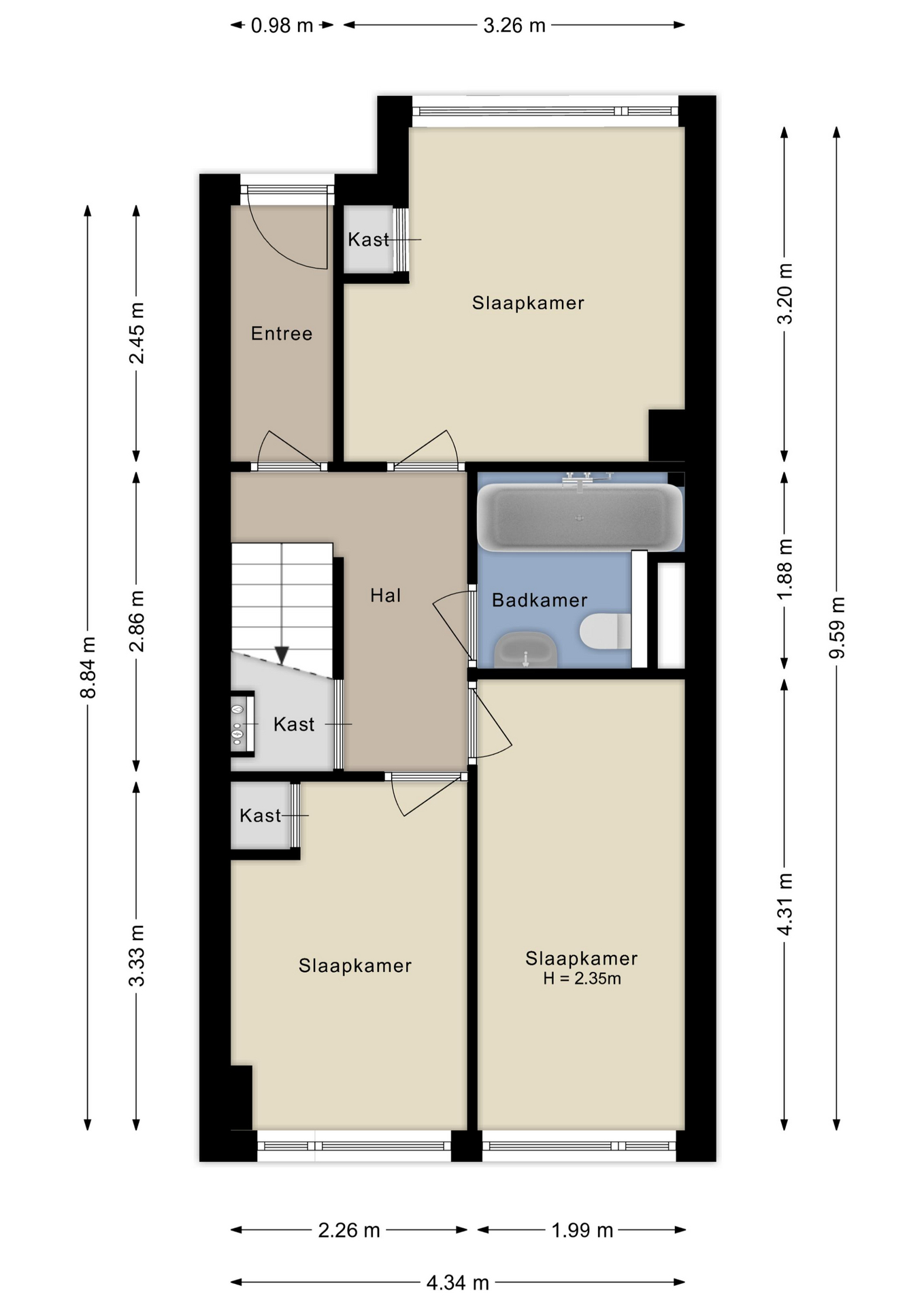 De entree geeft toegang tot een ruime hal, vanwaar je drie slaapkamers bereikt, de badkamer en de trap naar boven. De badkamer beschikt over een ligbad, wastafel en toilet.