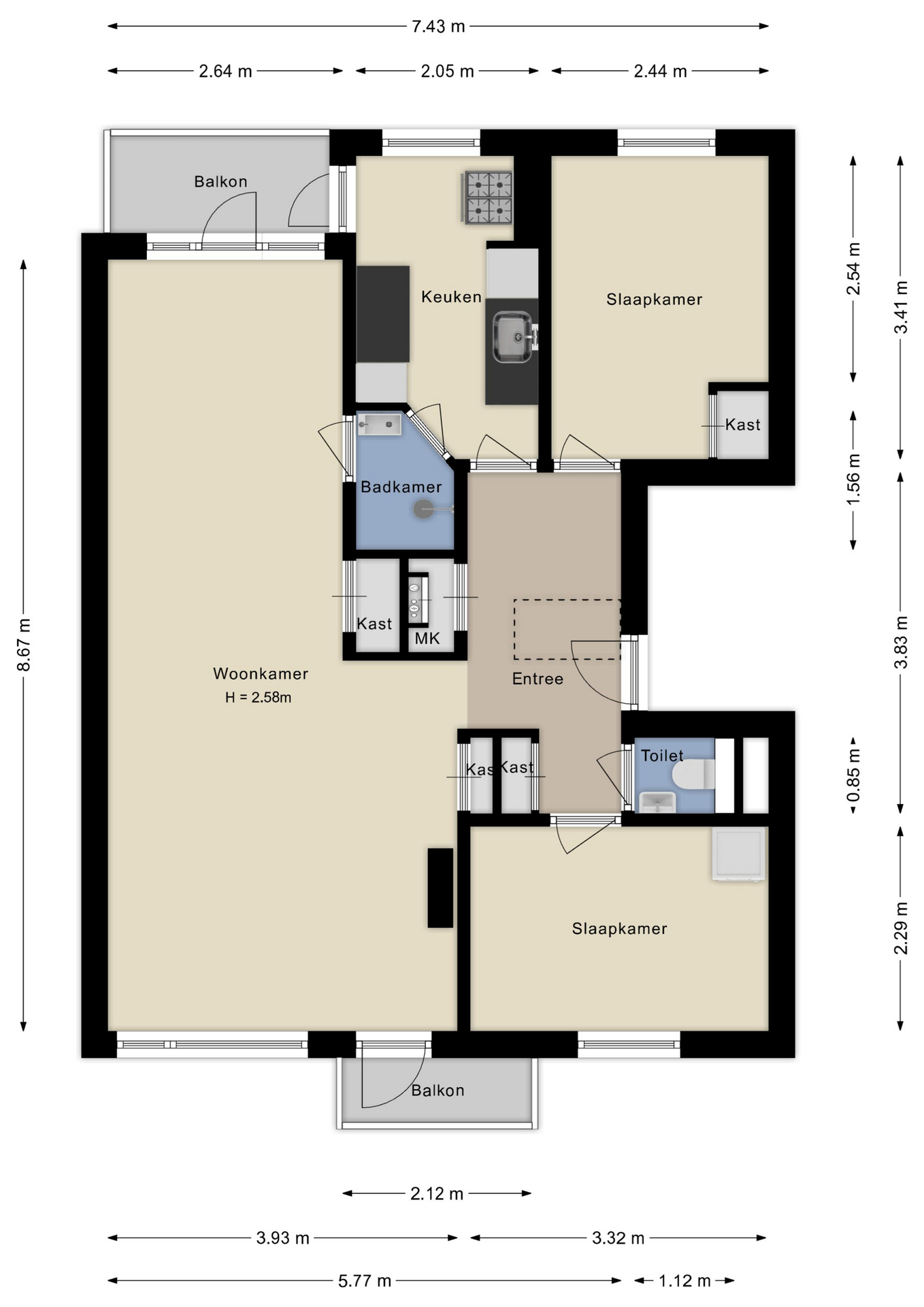 De lichte woonkamer is afgewerkt met een nette laminaatvloer, strak stucwerk en beschikt over twee praktische inbouwkasten. Vanuit de woonkamer is er toegang tot zowel het voor- als achterbalkon, waardoor je de hele dag door van de zon kunt genieten. De keuken is voorzien van een inductiekookplaat, oven, koelkast en vriezer en biedt eveneens toegang tot het balkon. De badkamer beschikt over een douche en wastafel en is zowel vanuit de keuken als vanuit de woonkamer bereikbaar. Daarnaast zijn er twee slaapkamers, beide voorzien van een laminaatvloer. Eén slaapkamer beschikt over een inbouwkast, de andere slaapkamer over aansluitingen voor wasmachine en droger. Vanuit de hal is via een vlizotrap de ruime zolderverdieping bereikbaar, waar zich de CV-combiketel bevindt en volop bergruimte aanwezig is.