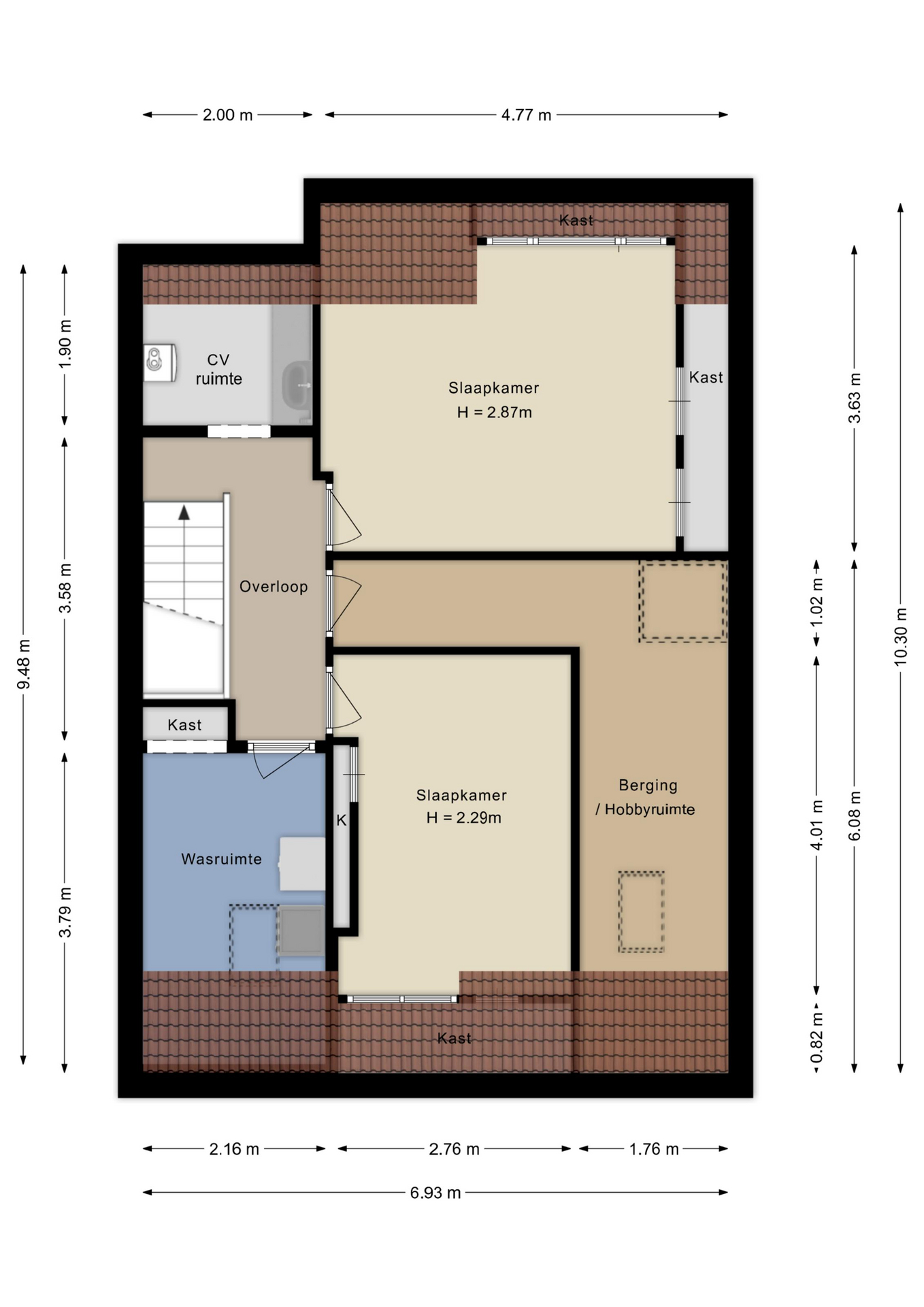 Overloop met toegang tot de C.V.-ruimte met wastafel. Wasruimte met opstelmogelijkheden voor wasmachine en droger. Twee ruime slaapkamers met vaste kasten. Zeer ruime berging.