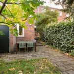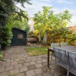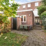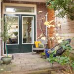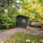 De tuin aan zuidwestzijde is opvallend ruim. Door de gunstige ligging kun je hier ’s zomers tot laat op de avond van de zon genieten, onder de overkapping zit je lekker beschut. Er is ruimte voor meerdere zitjes, veel groen en een tuinhuisje achterin. Grenzend aan de uitbouw vind je een stenen kast.
