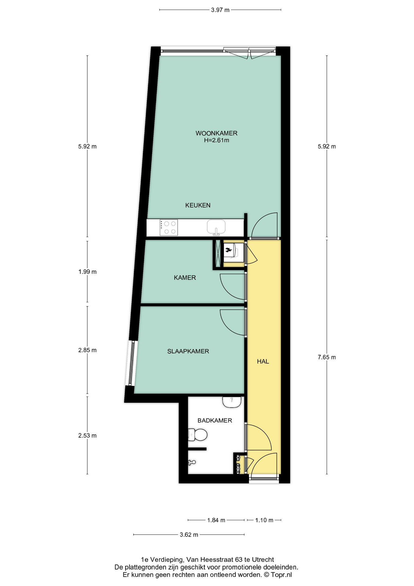 Van Heesstraat 63, Utrecht Goed onderhouden tweekamerappartement, gelegen op de eerste verdieping (hoek)van een kleinschalig appartementencomplex. Het appartement is voorzien van een ruime woonkamer met keuken, badkamer met inloopdouche, een slaapkamers en een