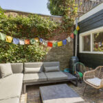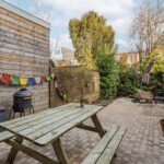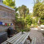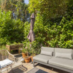 Openslaande deuren vanuit de woonkamer geven toegang tot de achtertuin van circa 10 meter diep en bijna 6 meter breed. Dankzij de gunstige ligging geniet je hier gedurende een groot deel van de dag van de zon, perfect voor om te bbqen, werken of ontspannen.