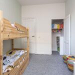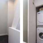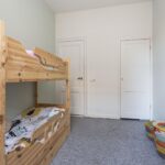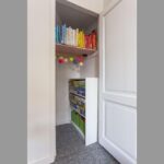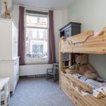 Via een vaste trap bereik je de tweede verdieping; hier tref je een derde slaapkamer en een praktische bergkast, waar je de cv-ketel opstelling en de witgoedaansluitingen vindt. Ook deze slaapkamer is voorzien van eenzelfde nette afwerking: lichte wanden, grijs gemêleerde tapijtvloer, en veel lichtinval door de grote dakkapel.