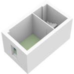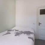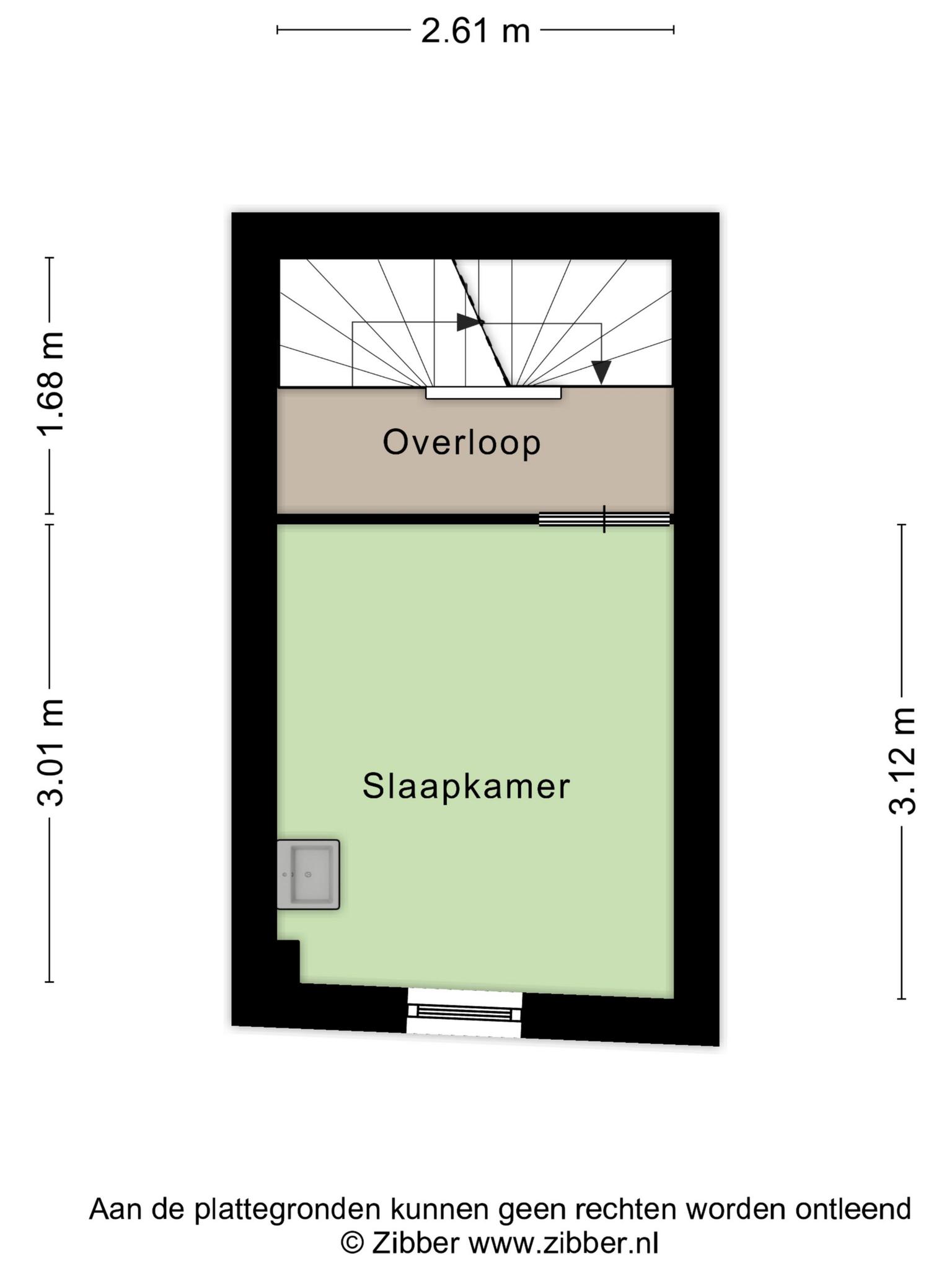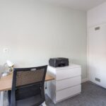 Via de overloop bereik je de tweede slaapkamer. De kamer is voorzien van eenzelfde nette afwerking, een prettige lichtinval door het schuifraam, met rolluik en een wastafelmeubel.