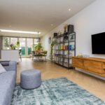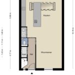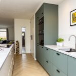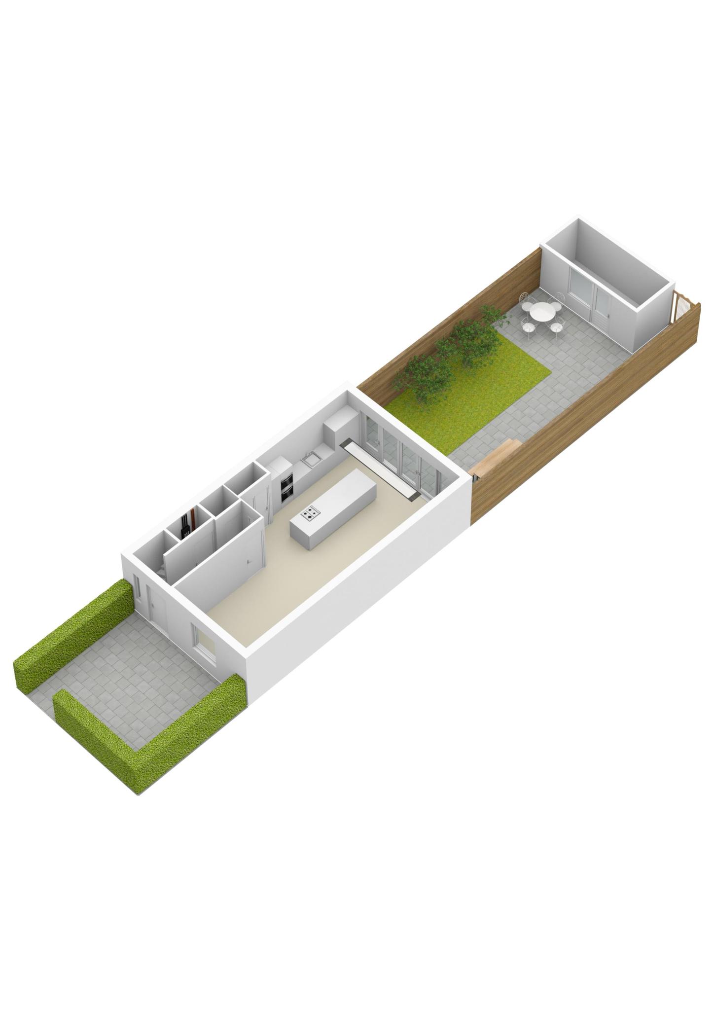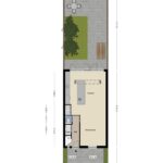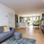 Je komt binnen via de hal met luxe tegelvloer, trapopgang naar de verdieping, garderobe, nette toiletruimte en trapkast met een nieuwe groepenkast van 12 groepen. Vanuit de gang is een doorkijk naar de tuin gecreëerd. Vervolgens bereik je de ruime living met vloerverwarming. Deze strekt zich van voor- tot achtergevel en is door raampartijen en hoge plafonds aan weerszijden heerlijk licht. Een mooie pvc vloer in visgraatmotief, hoge plinten en een strakke wandafwerking geven een rustige en verzorgde aanblik. Door spotverlichting krijgt het vertrek veel sfeer. De zithoek is gelegen aan de voorzijde en kijkt uit op de voortuin. Aan de achterzijde bevindt zich de royale woonkeuken, waar alle ruimte is voor een grote eettafel. Een vrijwel volledig glazen pui geeft zicht op de achtertuin, die middels dubbele openslaande deuren gemakkelijk bij de leefruimte kan worden betrokken. Bovendien valt door een lichtstraat een royale hoeveelheid daglicht binnen. De keuken bestaat uit een recht werkmeubel met tegenoverliggend een kookeiland met bar. Inbouwapparatuur betreft een inductiekookplaat met ingebouwde afzuiging, vaatwasser, koelkast, vriezer, oven en combi-oven. Ook tref je hier een grote inbouwkast met witgoedaansluitingen en opbergruimte.
