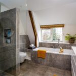 • Badkamer met ligbad, toilet, dubbele wastafel en regendouche