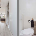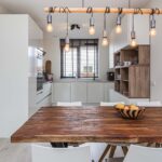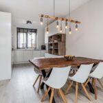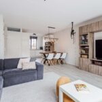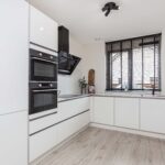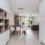 Aan de voorzijde bevindt zich de open keuken, uitgevoerd met een stijlvol composieten werkblad en voorzien van moderne inbouwapparatuur: een 4-pits inductiekookplaat, combi-oven, stoomoven, koel-vriescombinatie, vaatwasser (2023), afzuigkap en een Quooker. Hier kook je met gemak uitgebreide diners terwijl je in contact blijft met het gezin of je gasten aan de eettafel of in de woonkamer. Een fijne, complete keuken die zowel praktisch als uitnodigend is.