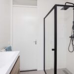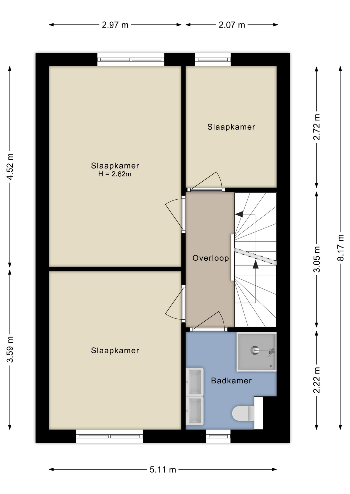 De overloop geeft toegang tot drie goed bemeten slaapkamers, allemaal prettig van formaat. De badkamer is modern en compleet ingericht met een dubbel wastafelmeubel, een inloopdouche en een toilet. Alles is verzorgd en logisch ingedeeld.