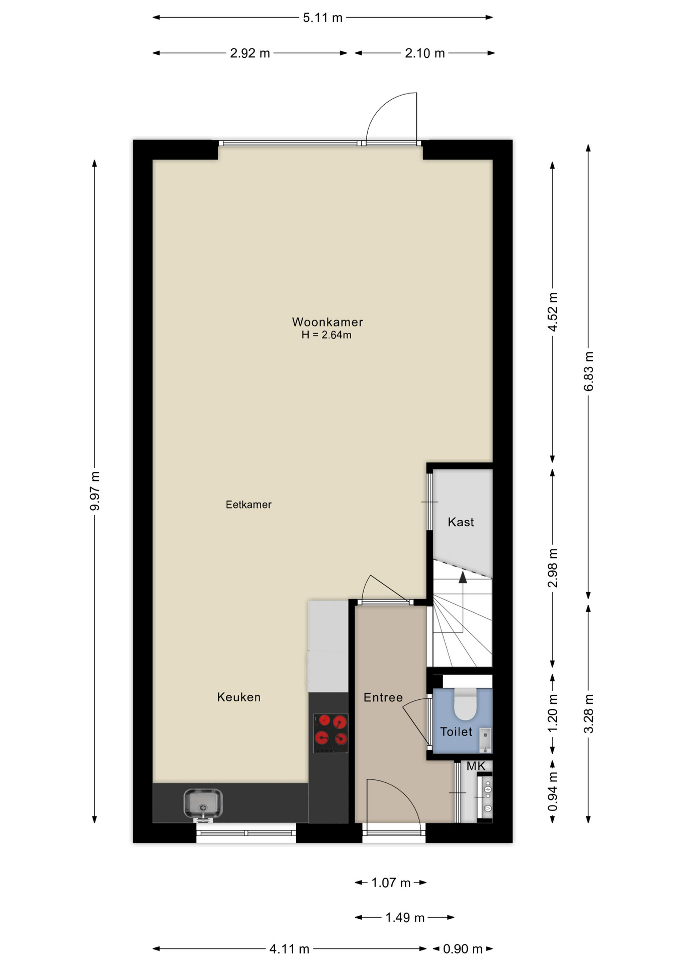 Via de hal met meterkast, toilet met fonteintje en trapopgang stap je de woning binnen. De uitgebouwde woonkamer is heerlijk ruim en wordt dankzij de grote raampartijen en de tuinligging op het zuidoosten prettig verlicht. Binnen loopt moeiteloos over in buiten, hier geniet je al vroeg op de dag van de zon.