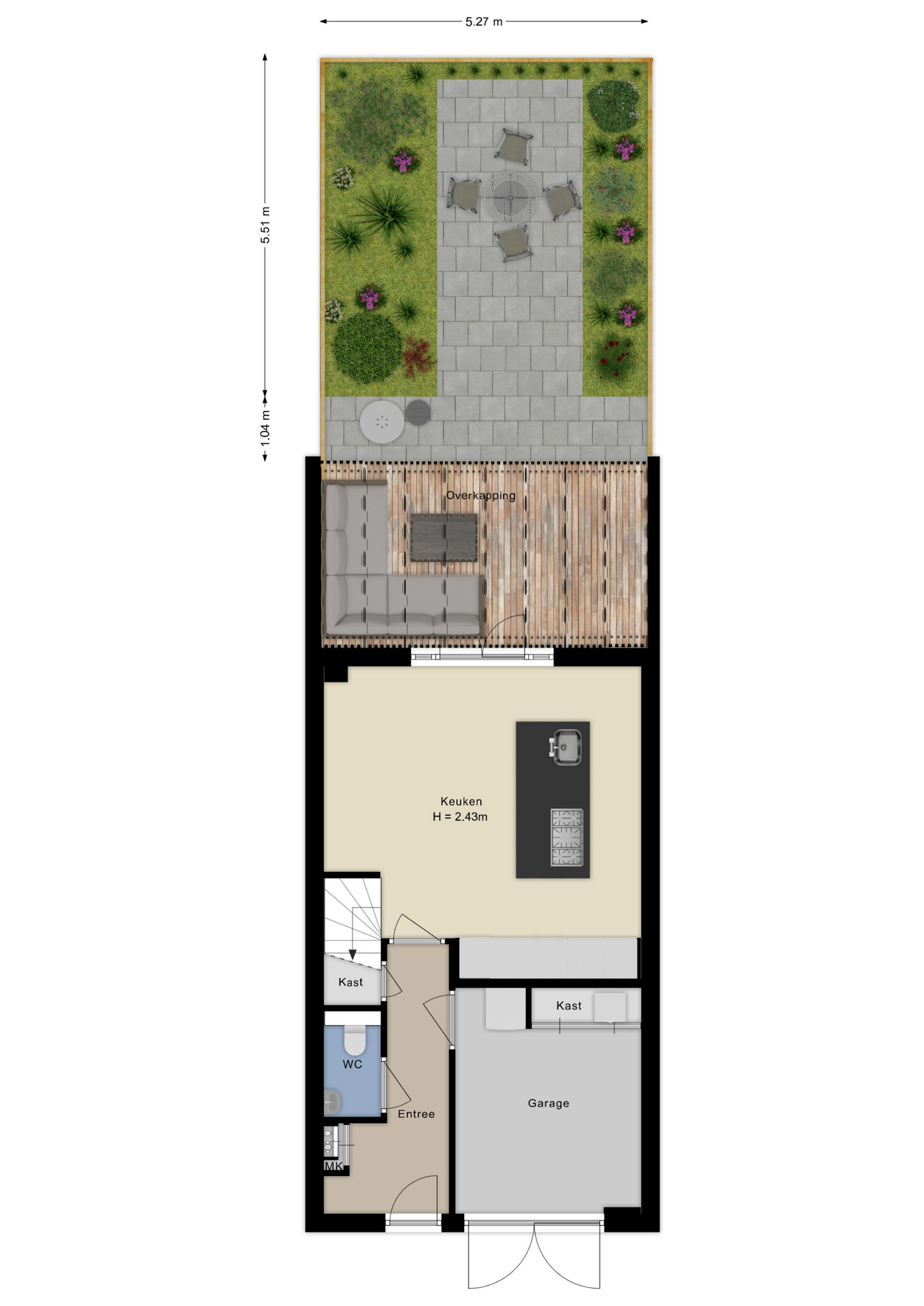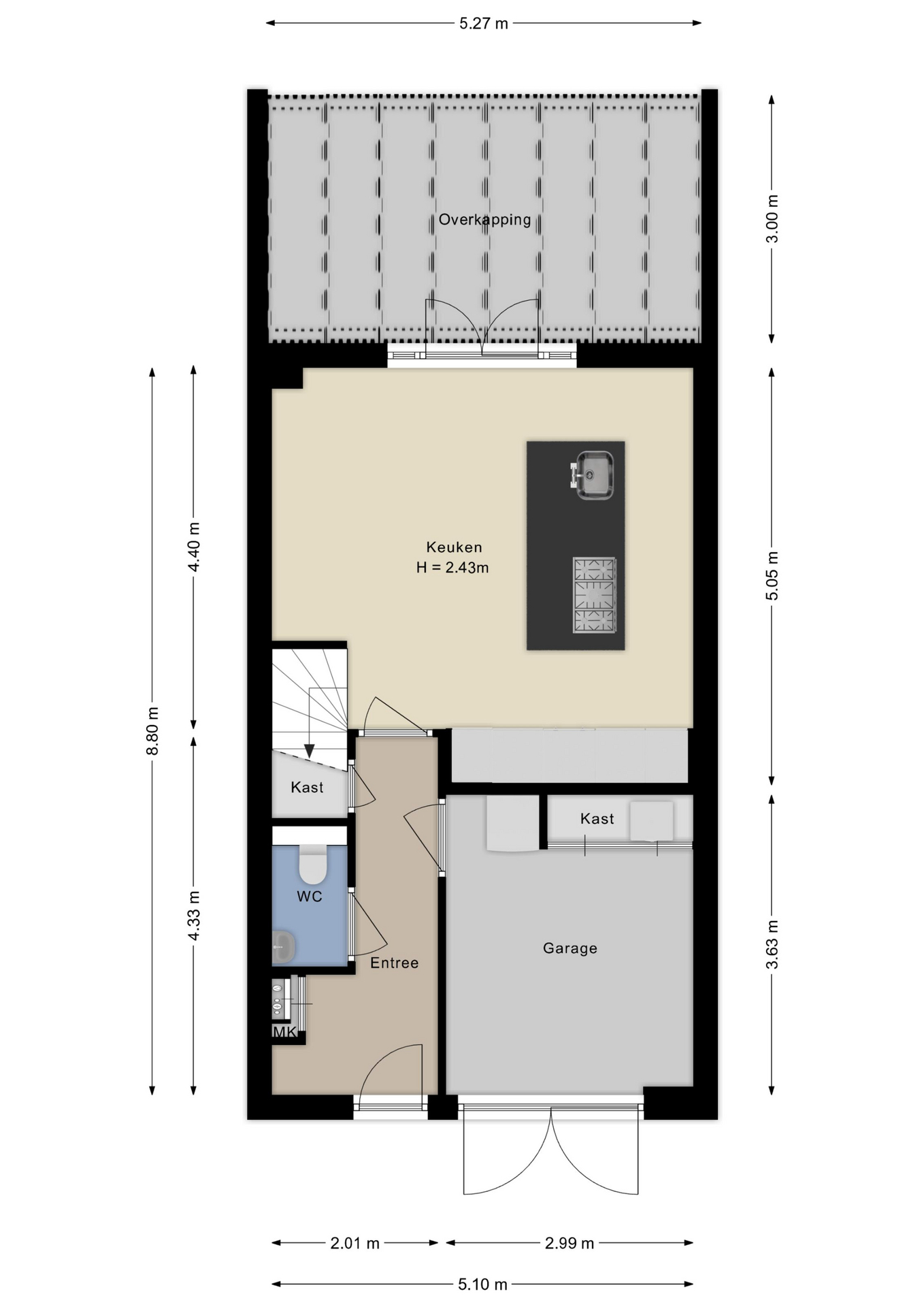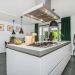 Entree, hal/gang met antraciet plavuizen v.v. vloerverwarming, meterkast, toegang tot een grote inpandige berging (ca. 3.63 x 2.99, voormalige garage) met spoelbak, aansluiting wasmachine en opstelplaats wasdroger, modern hangend toilet met fontein, toegang tot een in 2007 gerealiseerde en vergrote moderne woonkeuken, vernieuwd in 2018, (ca. 22 m²) v.v. antraciet plavuizen met vloerverwarming als hoofdverwarming, kookeiland met rvs spoelbak, 5-pits kookplaat, rvs afzuigkap, magnetron, oven, ingebouwde vaatwasser en veel laden rondom. Tevens is er een wand met veel lade- en kastruimte v.v. ingebouwde elektrische oven, magnetron en koelkast met vriesvak.