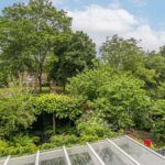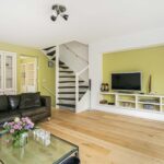 Vanuit de keuken via een open trap naar een lichte royale woonkamer (ca. 45 m²) op de 1e verdieping met prachtige eiken vloerdelen, een grote geïntegreerde werkplek/bureau en een Frans balkon met vrij uitzicht over de singel en kasteel Duurstede.