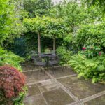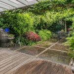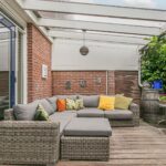 Vanuit de keuken toegang tot een bijzonder gezellig aangelegde tuin (ca. 10.00 x 5.00) op het zuiden, met een overkapping met vlonderterras en grote hardstenen terrastegels, borders met sierplanten en vrij uitzicht aan de achterzijde. Een achterom met sierlijke stalen poort en een buitenkraan zijn aanwezig. Het is hier heerlijk vertoeven in de zomer met veel zon en privacy. Achter de woning is een speeltuin aanwezig en loop je zo naar het Kasteelpark.
