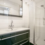 De dichte keuken is functioneel ingericht en staat in directe verbinding met de badkamer, die is voorzien van een inloopdouche en wastafel.