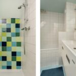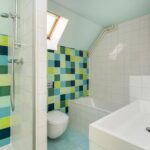 De moderne badkamer is geheel betegeld en voorzien van zowel een ligbad -als een douchecabine met thermostaatkraan, breed wastafelmeubel, hangend closet, designradiator en Velux-dakraam.