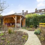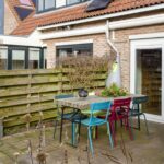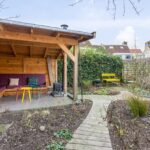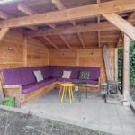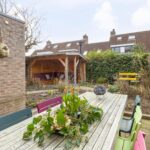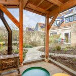 De heerlijk ruim bemeten en zeer zonnige achtertuin ligt op het zuidwesten en is fraai aangelegd met sierbestrating, groene borders en bomen via een plantenplan, diverse terrassen en een grote Douglas houten overkapping met een sfeervolle houtkachel en vaste banken met ingebouwde bergruimte.