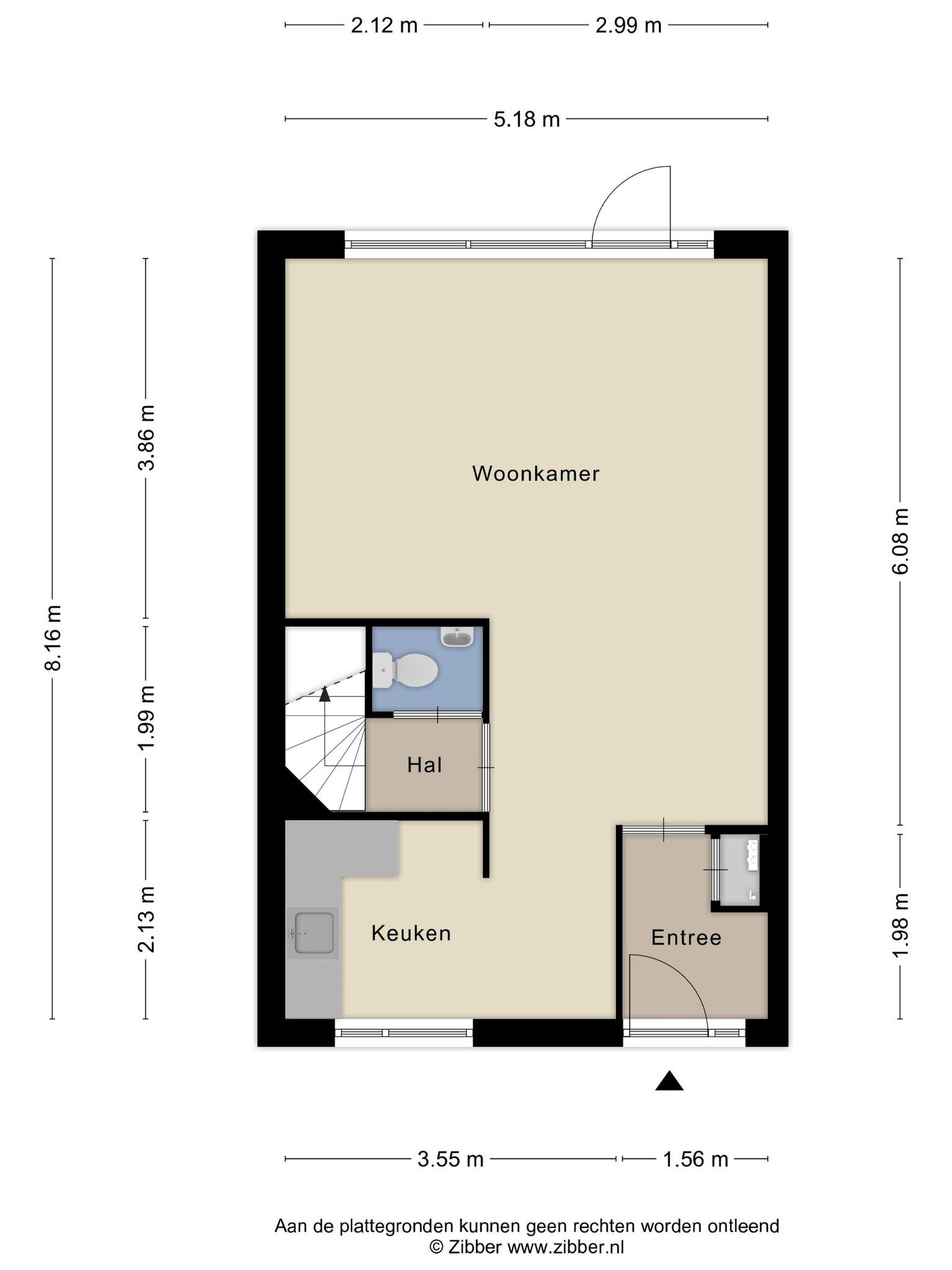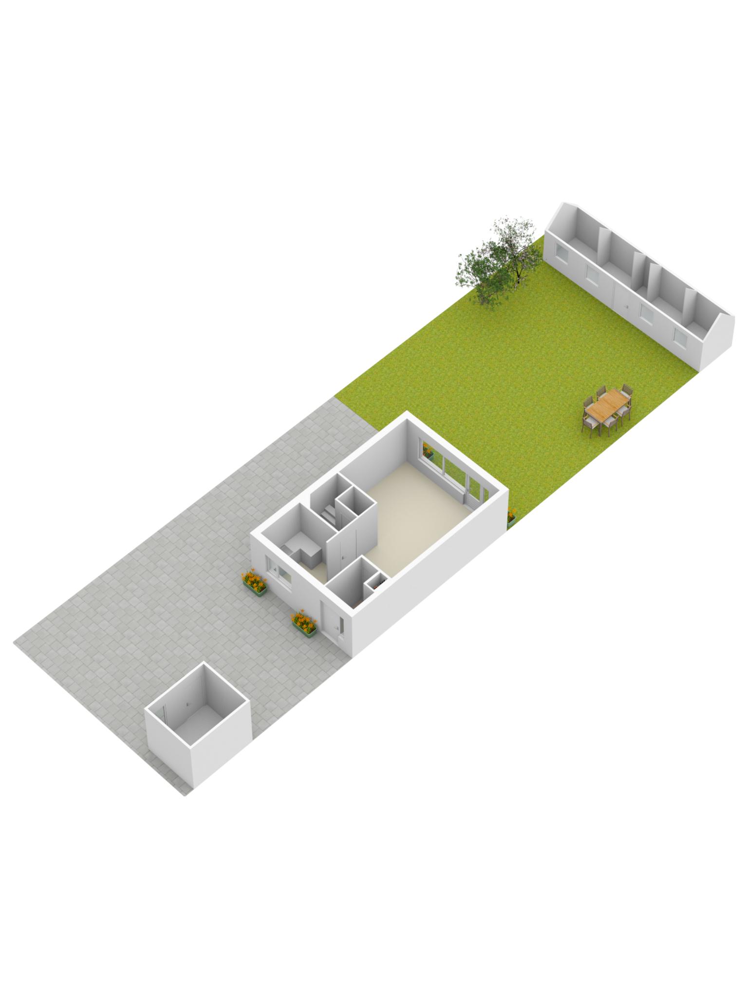 Oprit, stenen berging, entree, hal met meterkast en toegang naar de tuingerichte woonkamer. De standaard keuken is voorzien van een L-vormig keukenblok. Vanuit de woonkamer bereikt u de op het noordoosten gesitueerde achtertuin die gedeeltelijk is bestraat en een houten berging heeft. Het toilet met fontein en de trap naar de eerste verdieping zitten in het midden van de woning.