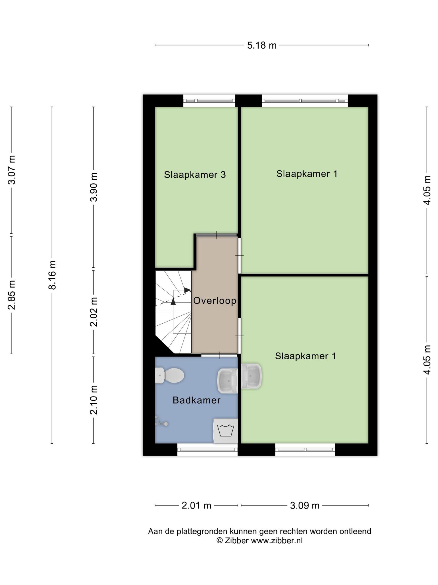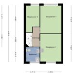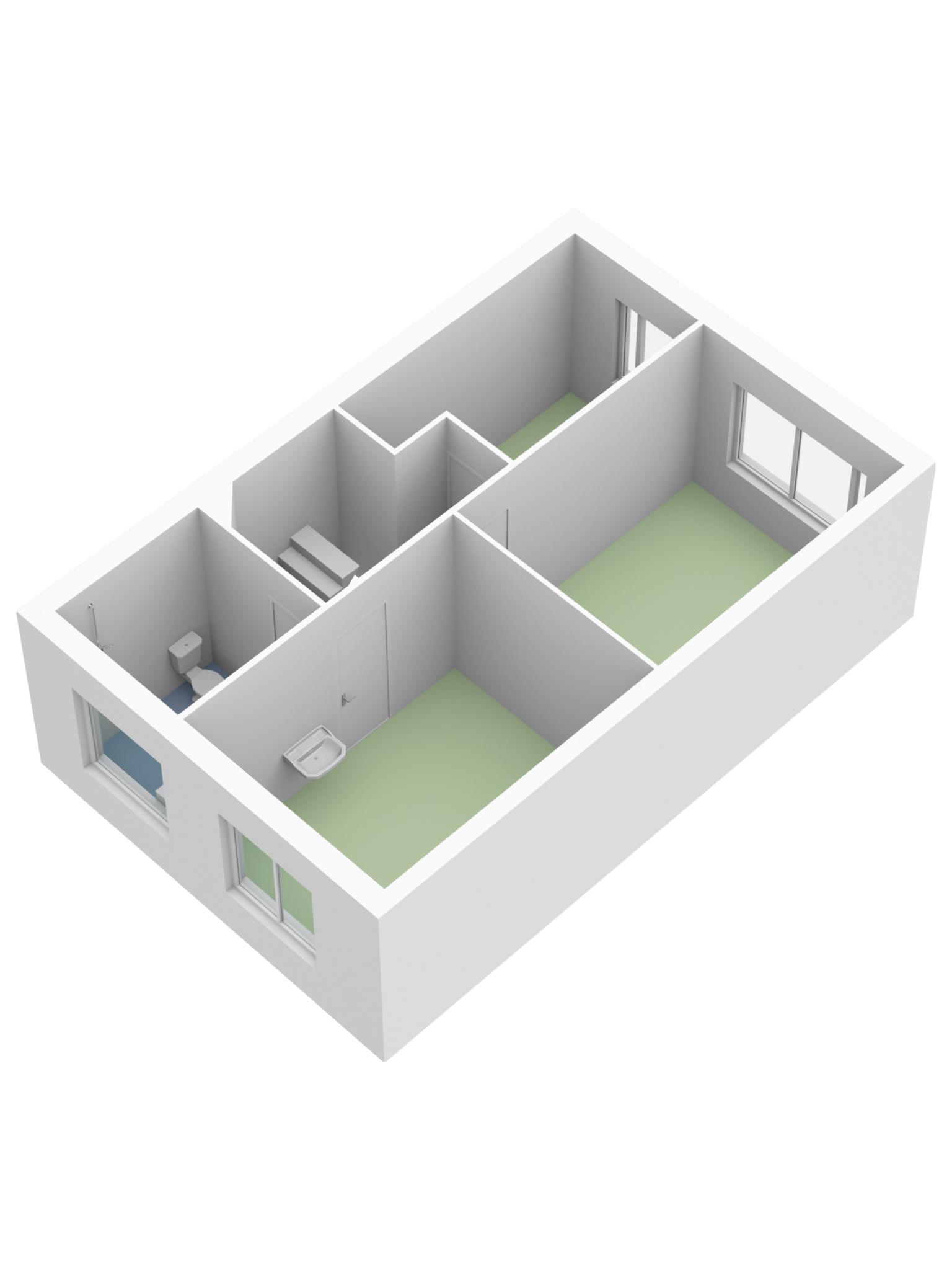 Overloop met toegang naar de 3 slaapkamers en de badkamer. De kamer aan de voorzijde heeft een wastafel. De badkamer is voorzien van een douche, toilet, wastafel en wasmachineaansluiting.