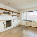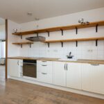 Vanuit het woon- en eetgedeelte heb je een mooi zicht op de open keuken. De keuken is uitgevoerd in een lichte kleur en voorzien van inbouwapparatuur. Zo is er een fornuis, oven en een werkblad met lekker veel ruimte.
