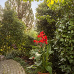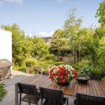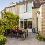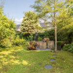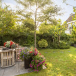 De achtertuin is breed, diep en fraai aangelegd met groen en meerdere terrassen, zodat je altijd een fijne plek hebt om te genieten van zon of schaduw.