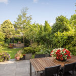 Fraai aangelegde achtertuin met meerdere terrassen.