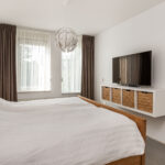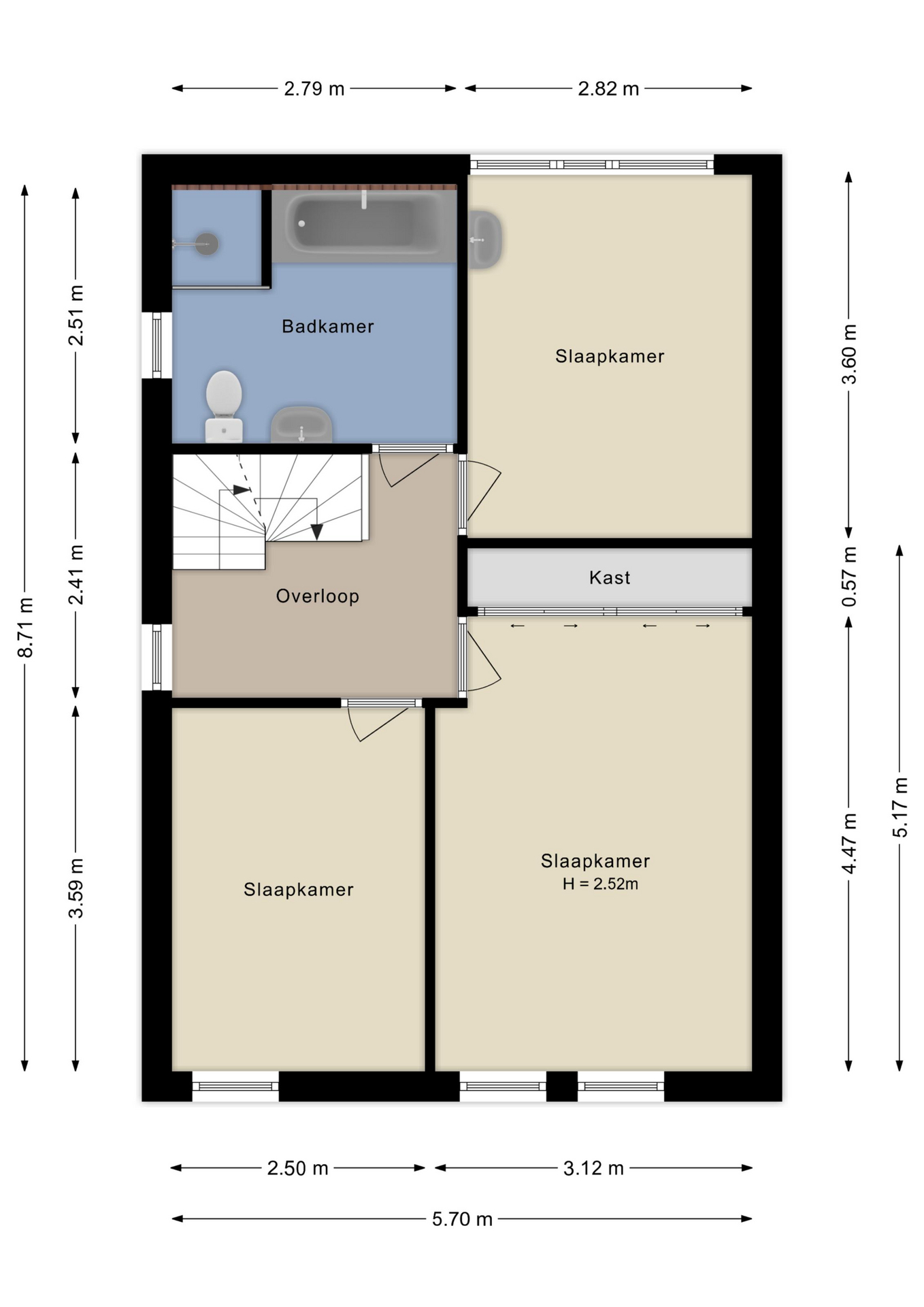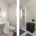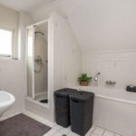 Overloop met drie ruime slaapkamers, waarvan een met een wastafel. De badkamer is comfortabel ingericht met douchecabine, ligbad, tweede toilet en wastafel.