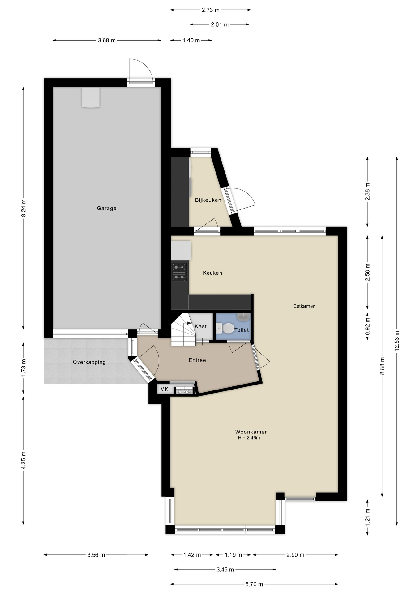 Ruime oprit met plek voor twee auto’s, overdekte entree en hal met meterkast, toiletruimte en toegang tot de garage. De woonkamer met sfeervolle erker is heerlijk licht en ruim en loopt over in de halfopen keuken met L-opstelling en diverse inbouwapparatuur. Aansluitend bevindt zich de bijkeuken met wasmachineaansluiting. De royale garage (30 m²) is inpandig bereikbaar en biedt volop mogelijkheden.