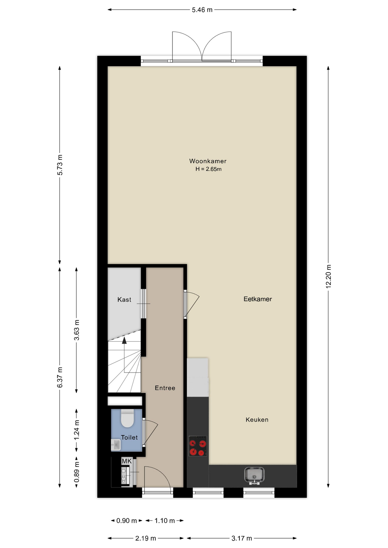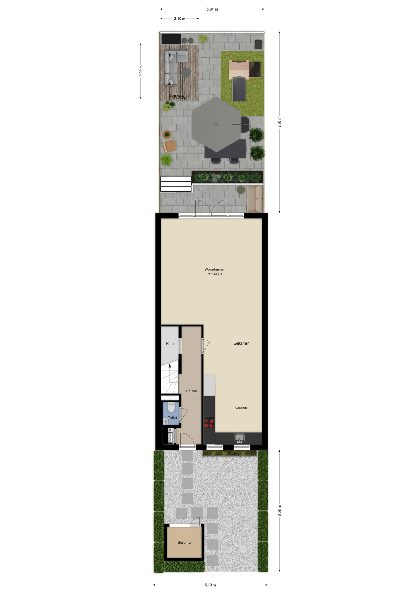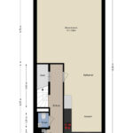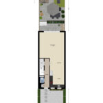 Op de begane grond voel je de harmonie tussen binnen en buiten naadloos samenvloeien. De ruim bemeten woonkamer kijkt uit op de tuin, die oostelijk is gesitueerd, zodat je vanaf het ochtendgloren heerlijk kunt ontspannen. Je vindt hier ook een trapkast voor praktische opbergruimte en een toegankelijke trapopgang naar de volgende verdieping.